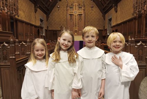 The Carol Choir is for children in 3rd – 6th grade. Our goal is to provide beautiful music for liturgies while instilling a love of singing and good choir habits at an early age. The RSCM approach is used in this choir. Choristers usually earn their yellow ribbon the first year and begin work on the light blue ribbon in their second year. As choristers prepare their music they learn the basics of music theory and the fundamentals of singing. This choir leads our best-attended Christmas Eve service, along with our St. Cecilia Choir. In 2023 the Carol Choir was honored to be the core group in the Diocesan Choir that sang for the consecration of our new Bishop, The Right Reverend Dr. Sally French.